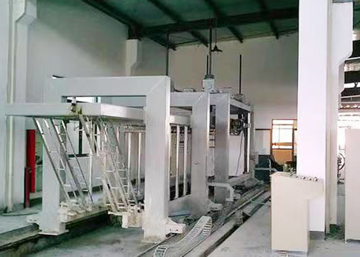 工作原理: 翻轉(zhuǎn)吊具把模具帶坯體一起空中翻轉(zhuǎn)90度置切割小車上,脫模把坯體連同側(cè)板留在切割小車上,切割小車由電機(jī)作動(dòng)力行走,通過縱切裝置完成縱向切割、銑槽、水平切割;切割小車?yán)^續(xù)行走至橫切裝置中央位置停止后,橫切裝置啟動(dòng),橫切架自上而下垂直下切完成橫向切割;切割小車再行走至編組吊具處由編組吊具將坯體(連側(cè)板)吊至蒸養(yǎng)小車上,切割小車返回原始位置進(jìn)行下一個(gè)切割循環(huán)。 主要特點(diǎn): ⑴、 機(jī)型結(jié)構(gòu)精簡(jiǎn)實(shí)用,便于安裝維修; ⑵、 坯體側(cè)立放置使坯體寬度為600mm,高度為1200mm,切割鋼絲短,不易拉斷,不易飄移,切割精度高; ⑶、 縱向切割裝置固定,切割小車行走完成縱向切割,切割時(shí)間短。橫切裝置采用鋼絲水平下切,縮短切割鋼絲長(zhǎng)度,保證切割精度; ⑷、 坯體側(cè)立后可縱向切割時(shí)完成銑槽,不需另配槽口加工設(shè)備; ⑸、 本機(jī)型對(duì)坯體作六面切割,制品質(zhì)量不受模油及模具變形影響; ⑹、 本機(jī)型除生產(chǎn)砌塊外還可生產(chǎn)板材; ⑺、 機(jī)型切割過程(翻轉(zhuǎn)、縱切、橫切)分不同工位完成,各工位工作簡(jiǎn)化,操作保養(yǎng)方便。